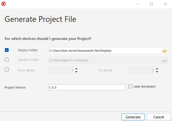 * **Deploy Folder** - Path where the update will be generated. Kalipso will create a folder with the necessary files. You can change the path.
