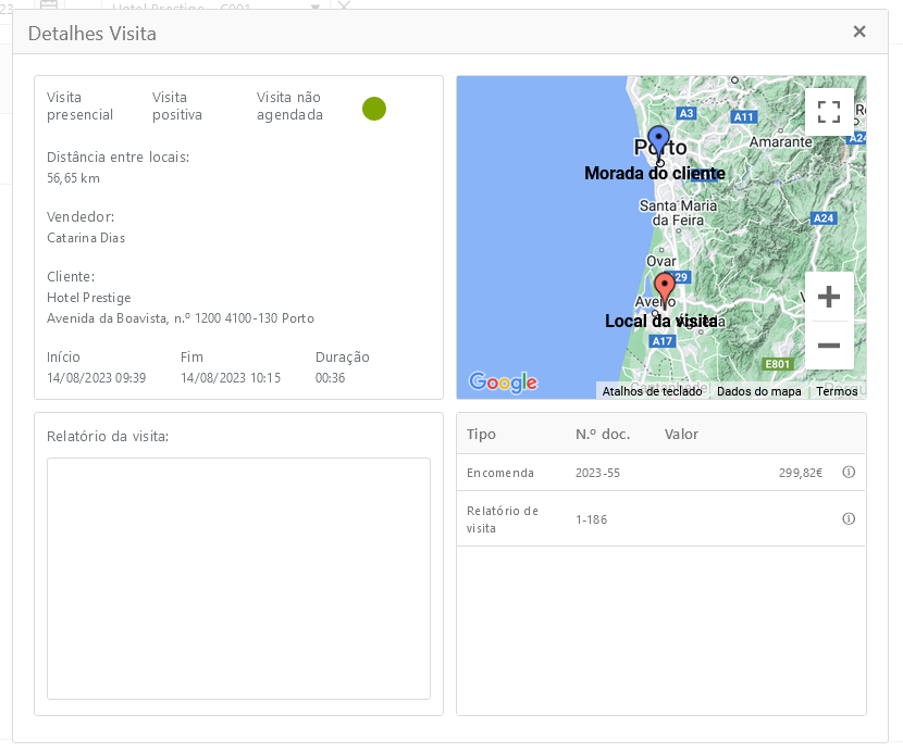 Relatório da visita - Área onde se visualiza o relatório da visita feito pelo comercial.