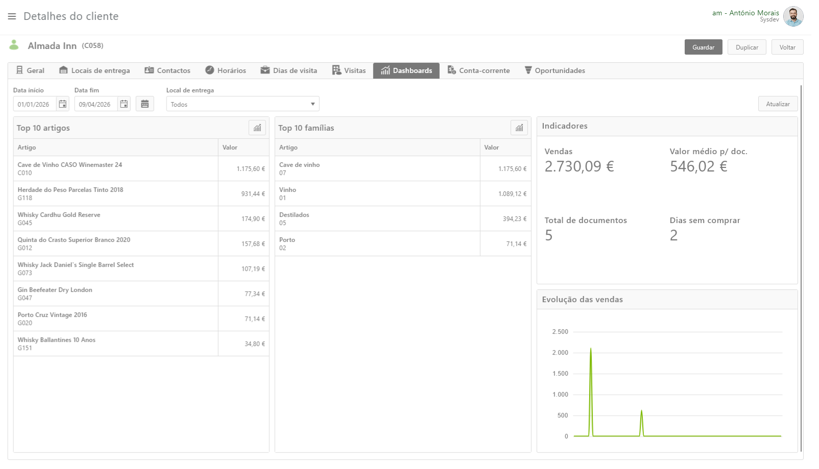 No separador Dashboards são apresentados dados de resumo de vendas com incidência nos 10 artigos e famílias mais vendidos e indicadores com totais de vendas, valor médio por documento, total de documentos e há quantos dias é que o cliente não compra.