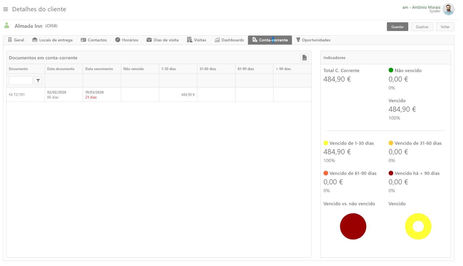 Do lado direito disponibilizam-se indicadores com os totais de saldo por saldo vencido e não vencido, assim como o intervalo de tempo para o saldo vencido.