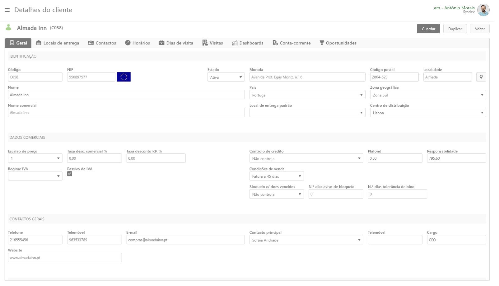 No separador Contactos são criados os contactos pessoais dessa Entidade.