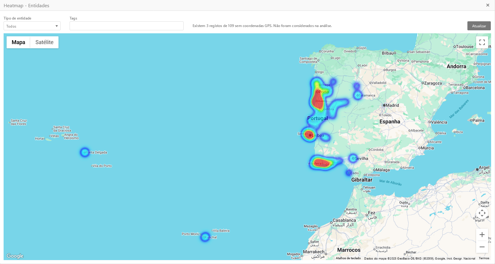 Para a correta utilização de *heatmaps* as Entidades têm de ter coordenadas GPS (latitude e longitude) associadas à sua ficha.&#x20;