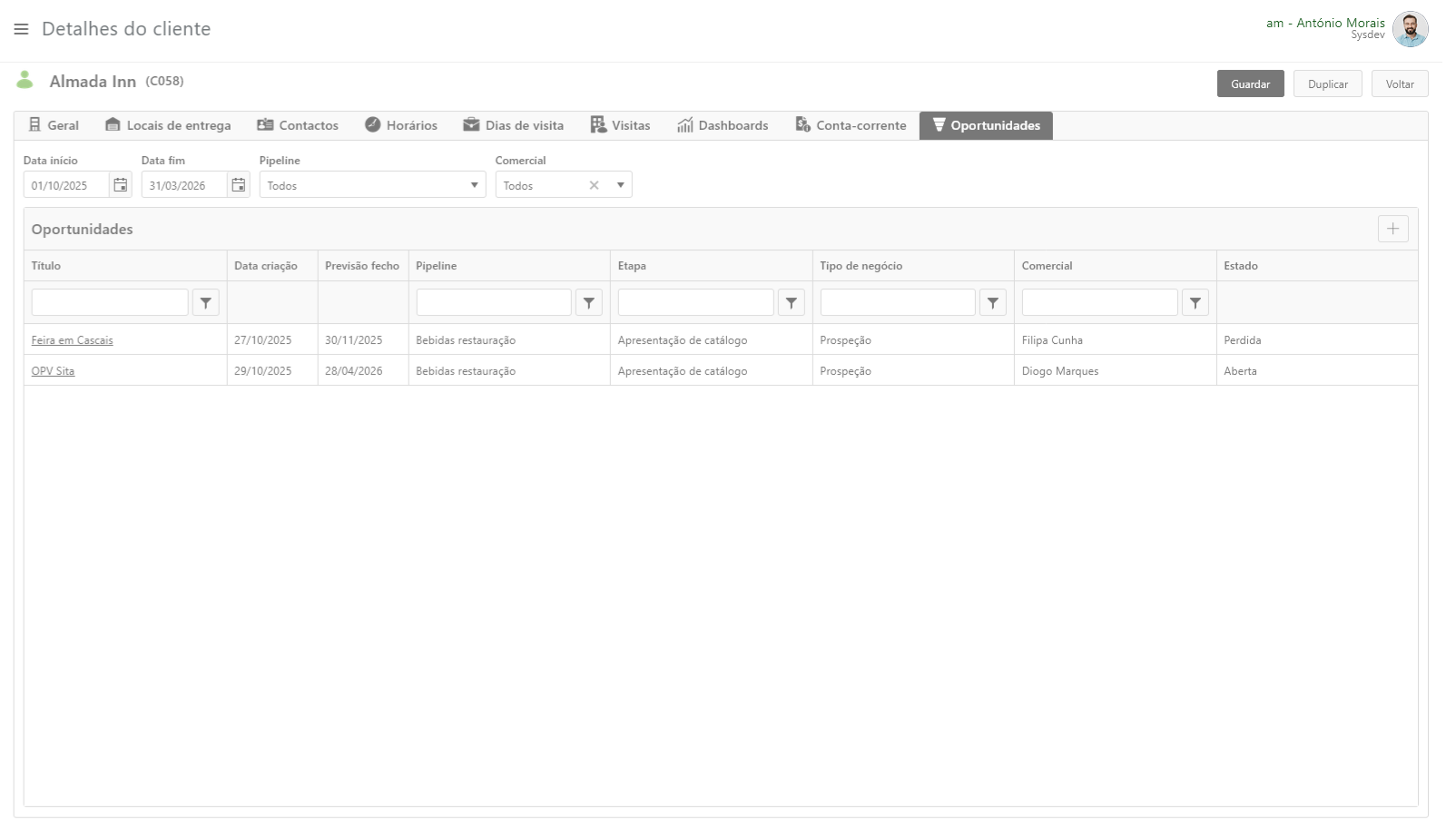 O separador oportunidades apresenta as oportunidades que foram/estão criadas para a Entidade selecionada.