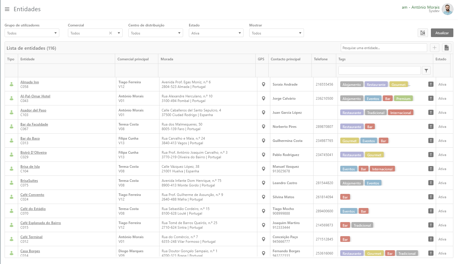 Ao escolher a opção "Entidades" surge uma grelha com todas as entidades da empresa.
