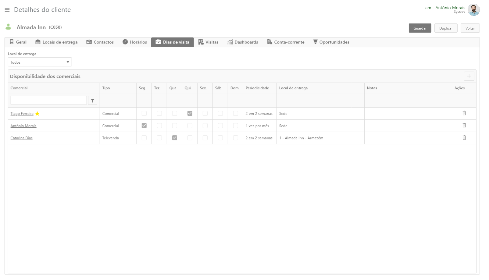 No separador Dias de visita associa-se comerciais à Entidade e definem-se os dias de visita (e a periodicidade de visita nesses dias) para a Entidade.