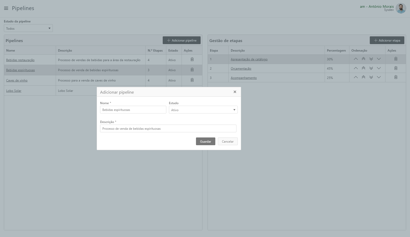 O ecrã está dividido em duas áreas: pipelines e etapas. Cada pipeline só é aplicável se tiver associadas etapas.
