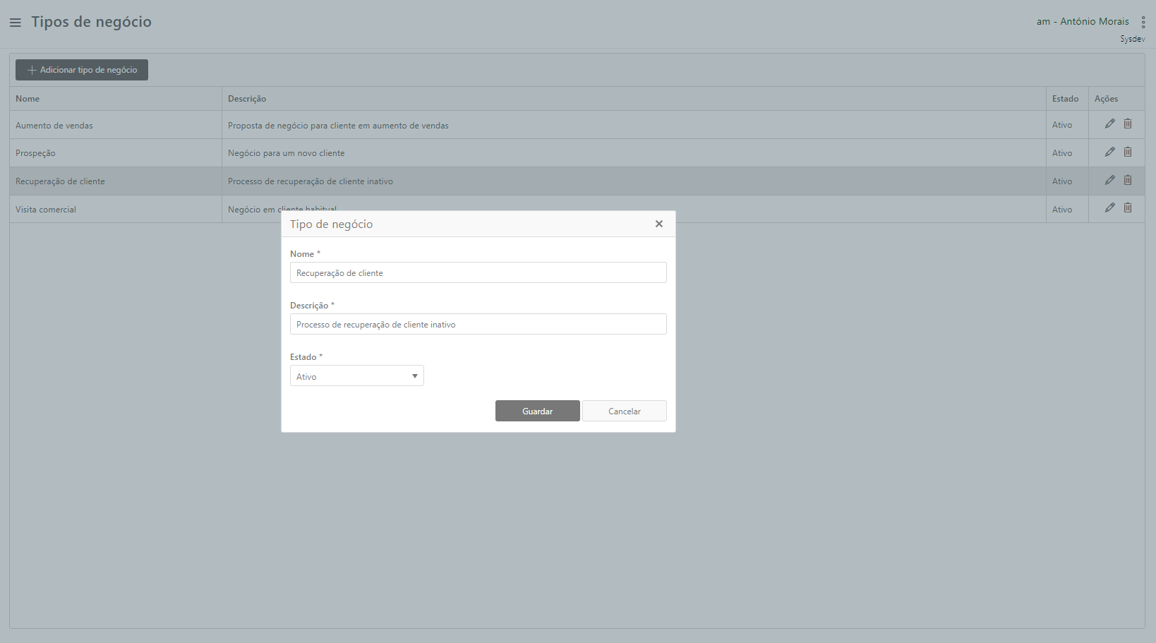 * **Estado** - O tipo de negócio pode estar ativo (por defeito) ou inativo.