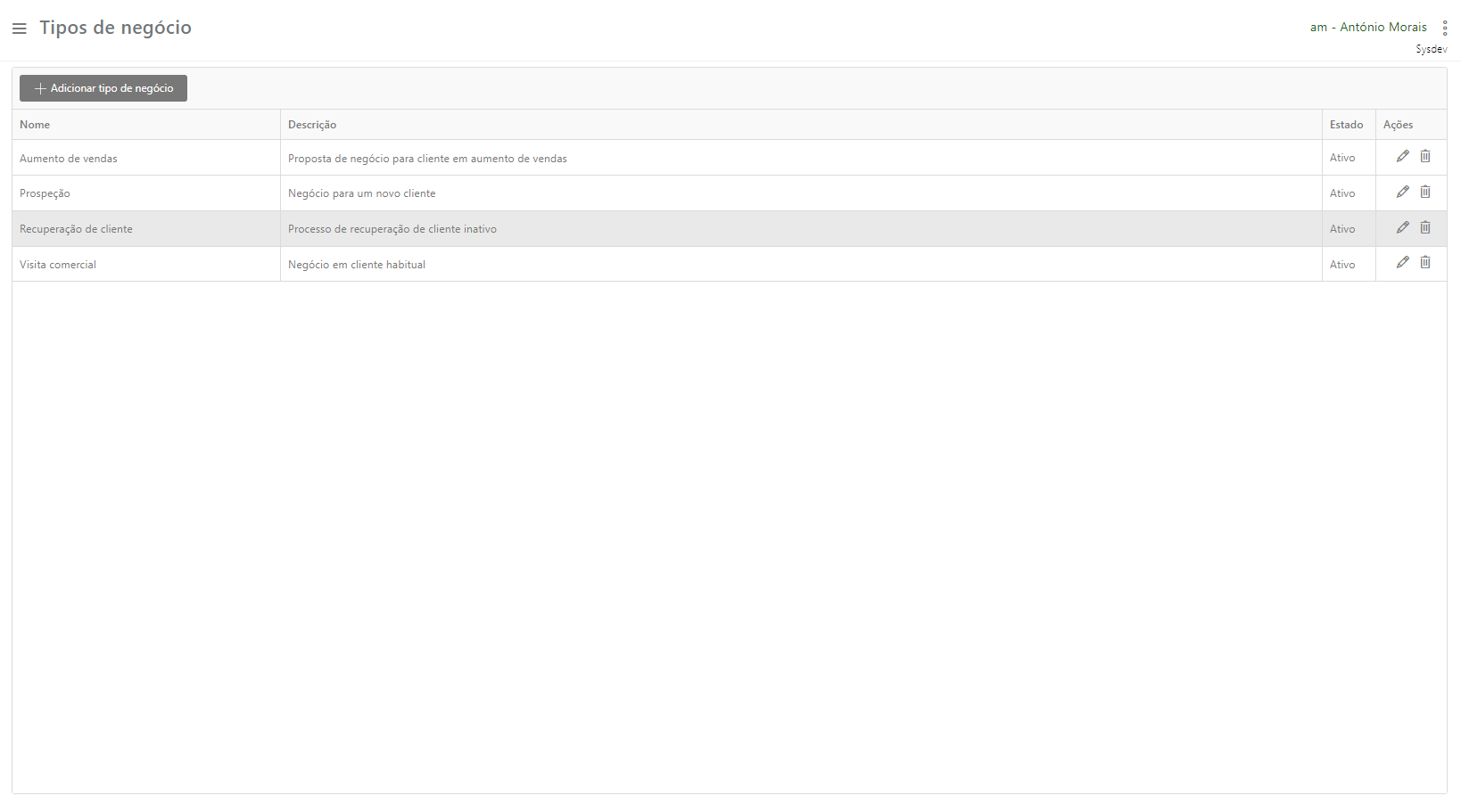 Neste ecrã estão os tipos de negócio criados com a informação relevante.