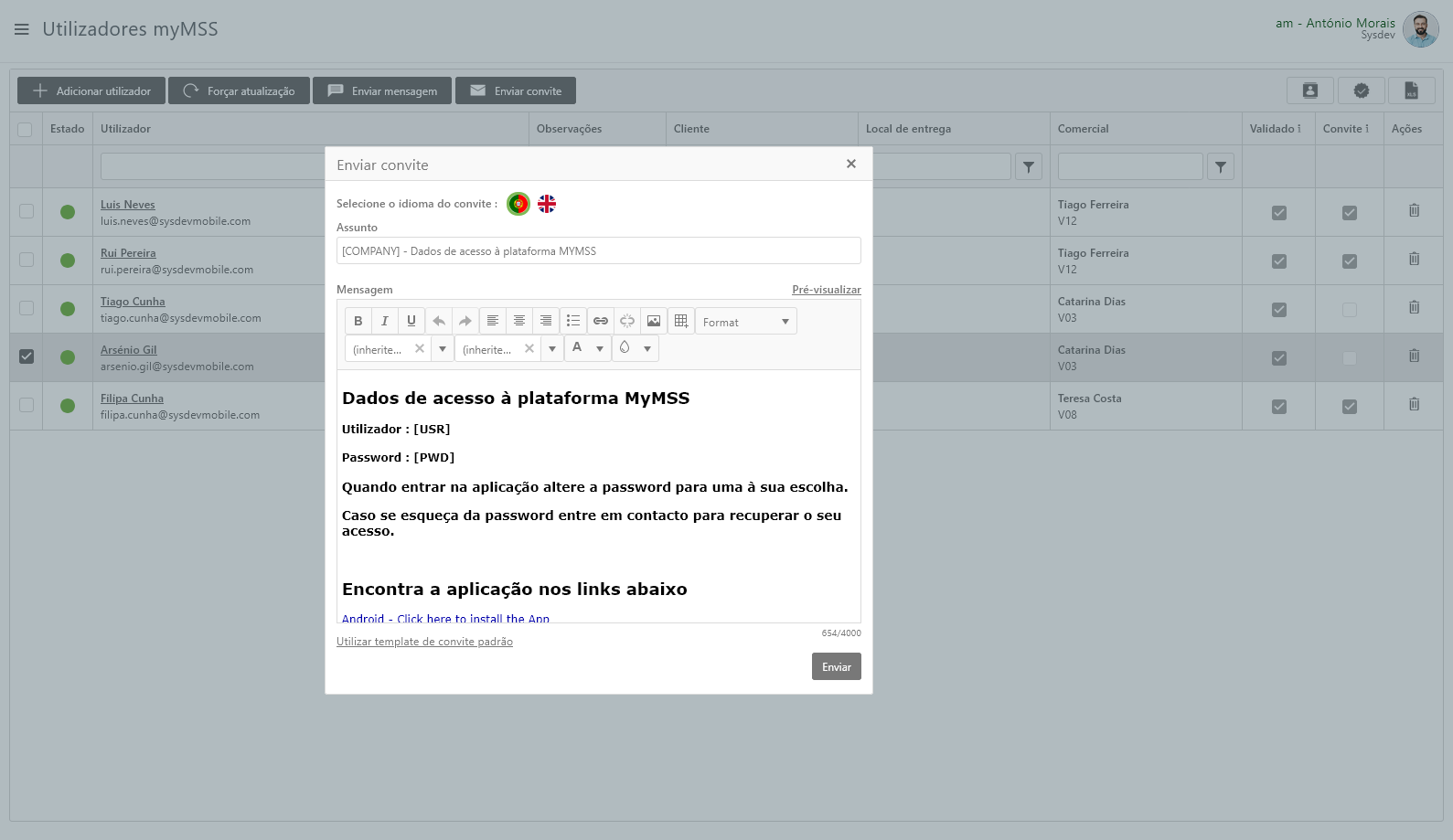 Quando se clica em Enviar convite surge uma janela com uma mensagem pré escrita que pode ser (ou não) utilizada para enviar o convite para o utilizador finalizar a configuração da aplicação e aceder com normalidade à mesma.