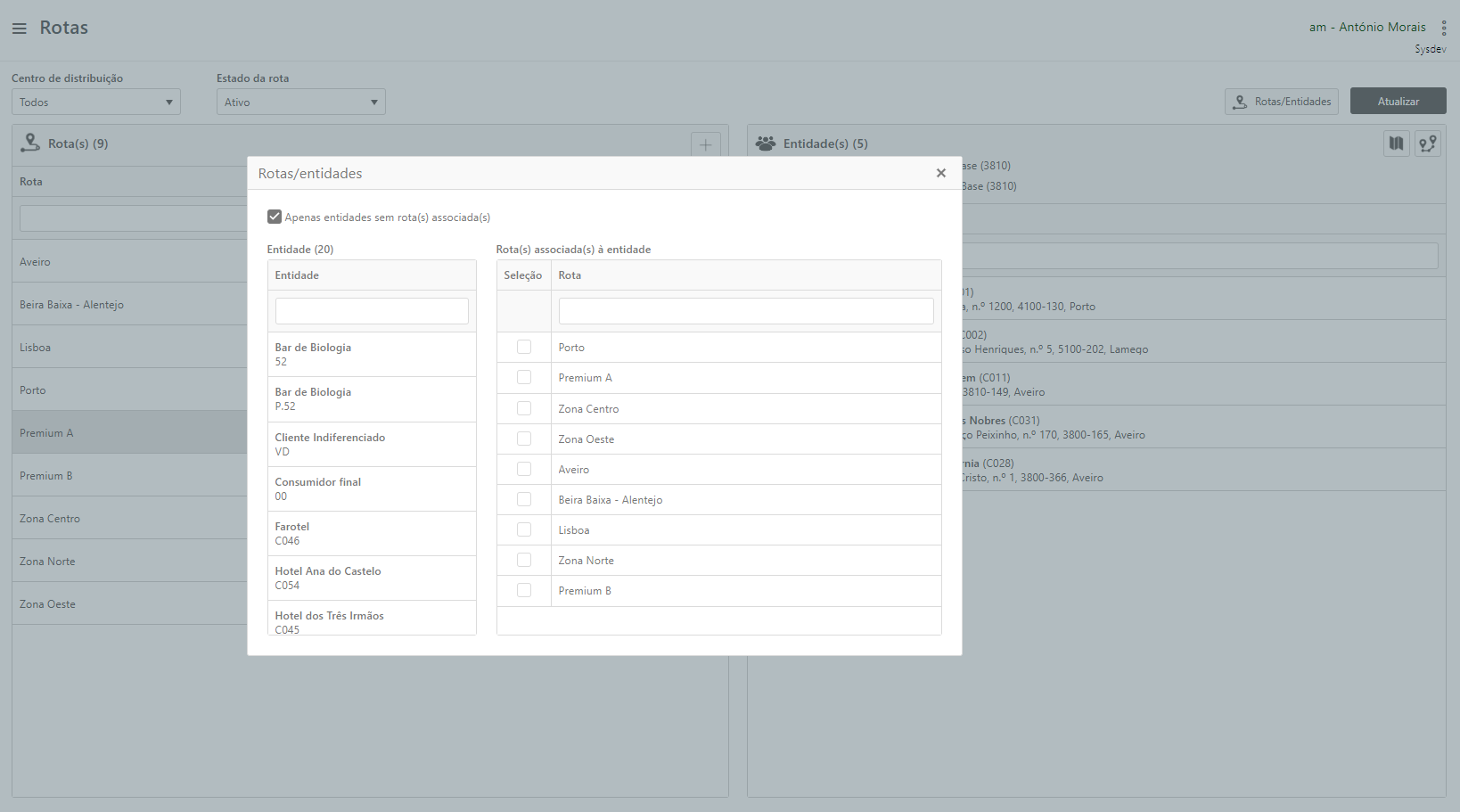 Quando se acede a esta opção visualizam-se as rotas criadas do lado esquerdo e do lado direito aparecem as entidades que estão associadas à rota selecionada.